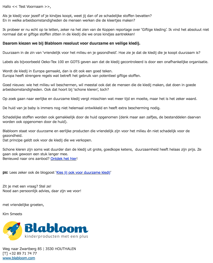 Blabloom verkoopt kinderproducten met een plus, producten die zorgvuldig geselecteerd werden op hun kwaliteit en bepaalde eigenschappen. Blabloom heeft een sterke missie en om die missie duidelijk naar hun klanten te communiceren, wordt er gebruikgemaakt van een reeks van e-mails.