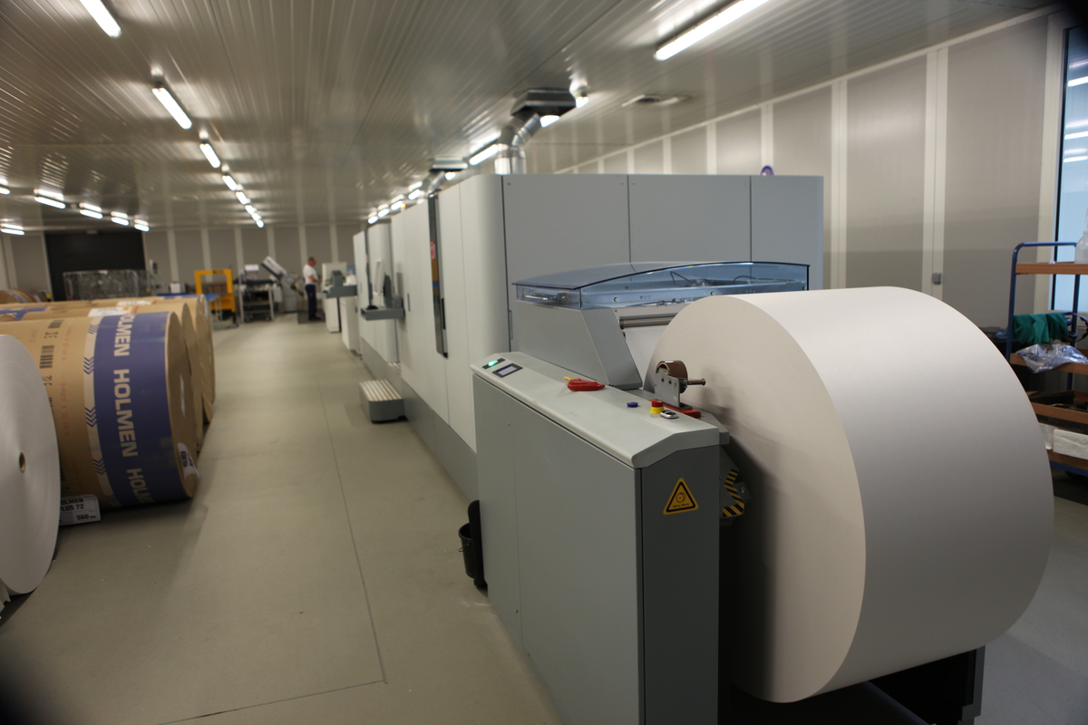 In de drukkerij staat één van de grootste digitale printers ter wereld. Alle kranten worden achtereenvolgens geprint op een bobijn papier. Eén bobijn papier is goed voor zo’n 20 km Happiedays-kranten.