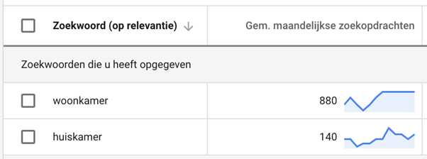 Je ziet 6 keer meer gemiddelde maandelijkse zoekopdrachten zijn op het zoekwoord: "woonkamer". We kunnen concluderen dat "woonkamer" een véél beter zoekwoord is dan "huiskamer".