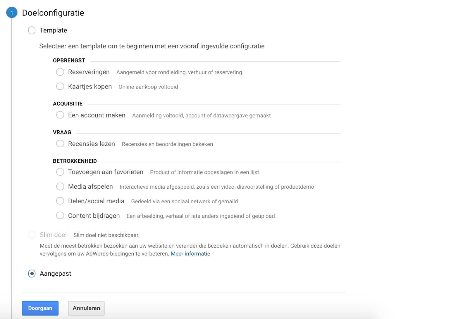 - Vervolgens kan je kiezen tussen ‘template’ om door te gaan met een vooraf ingevulde configuratie of ‘aangepast’ voor een nieuw doel. Kies je gewenste optie en klik op ‘doorgaan’.