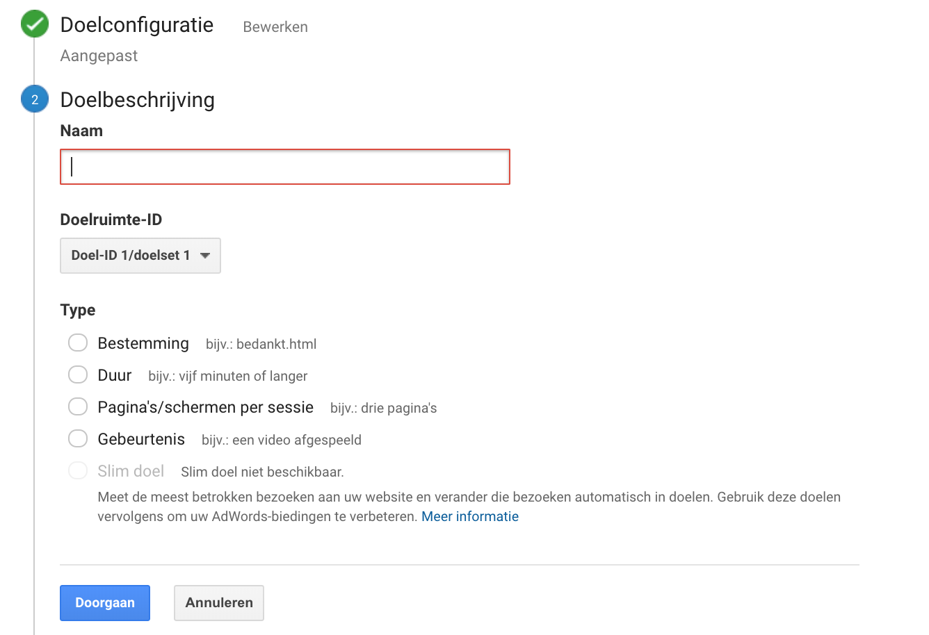 - Wanneer je ‘template’ hebt geselecteerd, zijn de naam en het doeltype automatisch ingevuld. Wanneer je voor ‘aangepast’ hebt gekozen, kan je zelf je doelnaam en het doeltype kiezen. Er zijn vier verschillende doeltypes: